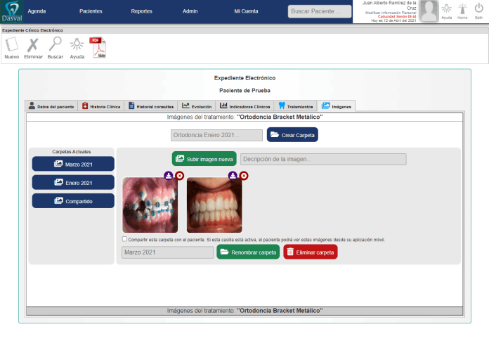 OdontaliX permite el almacenamiento ilimitado de imágenes (fotografías, radiografías, etc.) así como documentos en PDF por carpetas personalizadas en cada expediente del paciente.