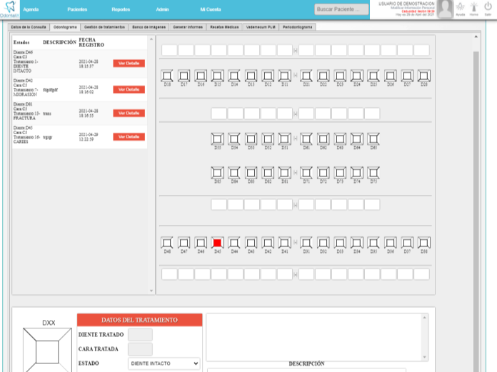 OdontaliX cuenta con la herramienta interactiva de Odontograma, en la cual podrás agregar tratamientos por cada cara de las piezas dentales.